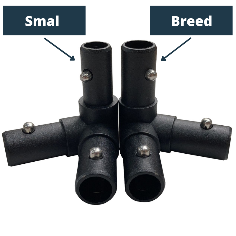Helaas kan het voorkomen dat bij harde wind of overbelasting het hoekstukje van de Support Frame breekt. De hoekstukjes verschillen in de diameter van het pijpje. Let daarom goed op bij het bestellen of je de smalle of de brede nodig hebt. Het verschil is te zien op de bovenstaande foto.